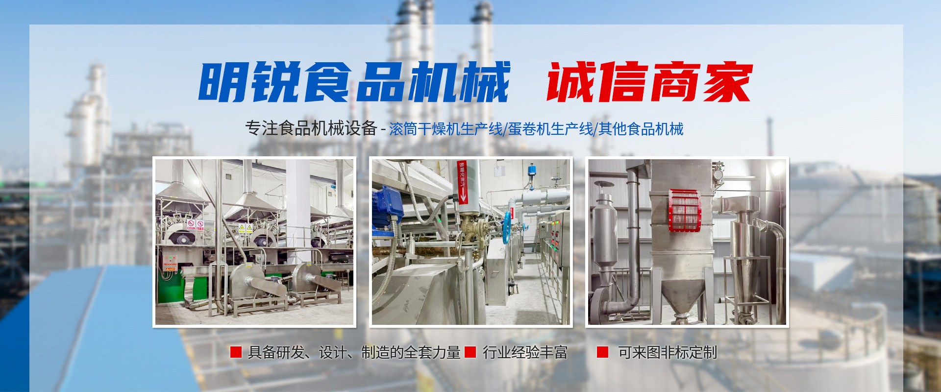 東臺市明銳食品機械有限公司是一個從事食品機械設備設計、制造和安裝調試的專業(yè)廠家,在食品生產工藝、生產流程及設備設計和制造有著多年豐富經驗。主要產品有蛋卷機生產系列,滾筒干燥機生產線系列以及其他食品機械。目前各種生產線規(guī)格齊全,國內技術優(yōu)良,產品遠銷亞洲各國及國內二十多個省市自治區(qū)。